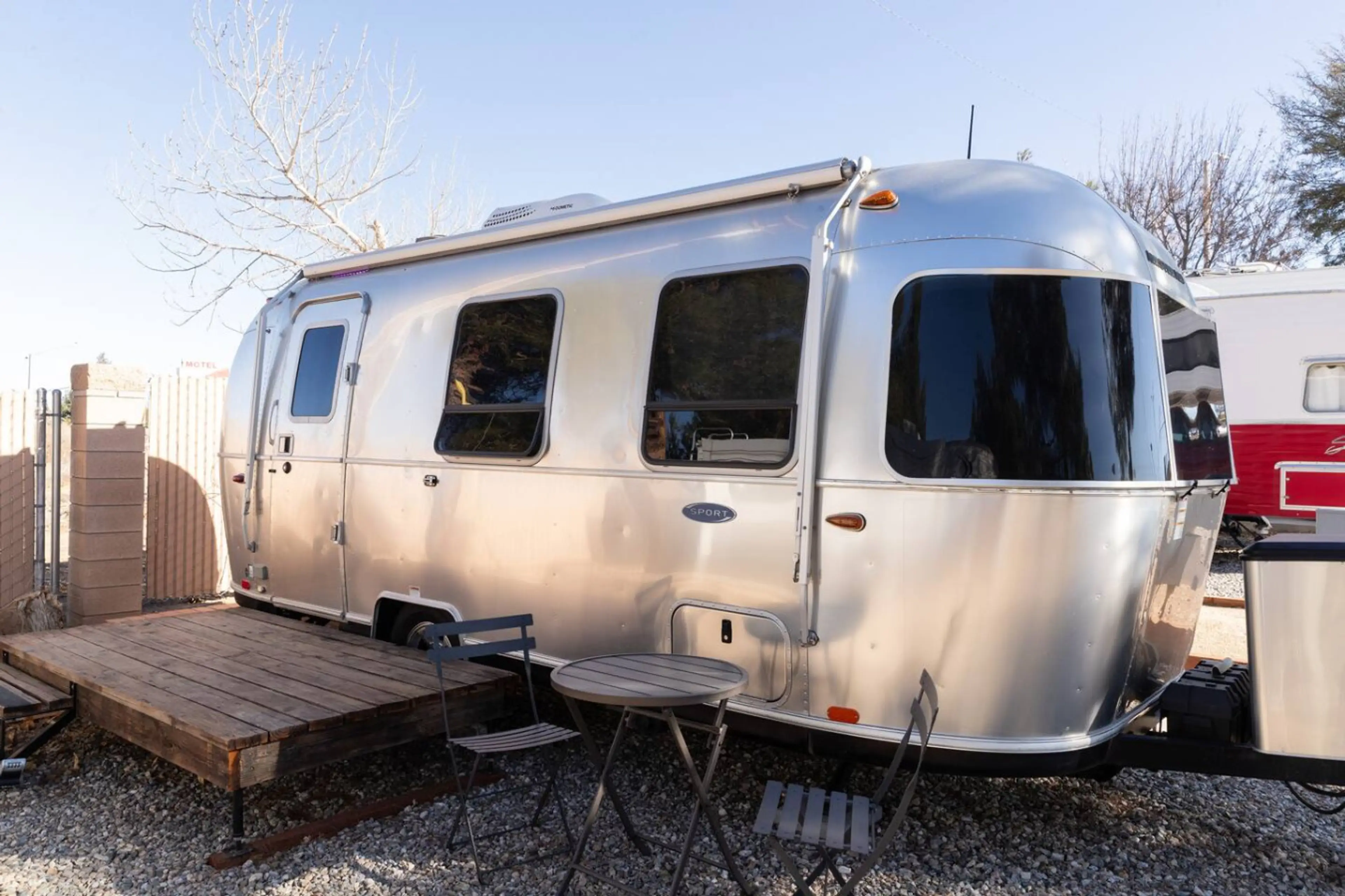 Stay in a stylish 2019 Airstream Sport 22’, blending retro charm with modern comfort. Perfect for up to 3 guests, it features a cozy full-size bed, convertible dinette, and a kitchenette with a cooktop, fridge, and sink. Enjoy a private bathroom, AC, heat, and a sleek design with panoramic windows. ...