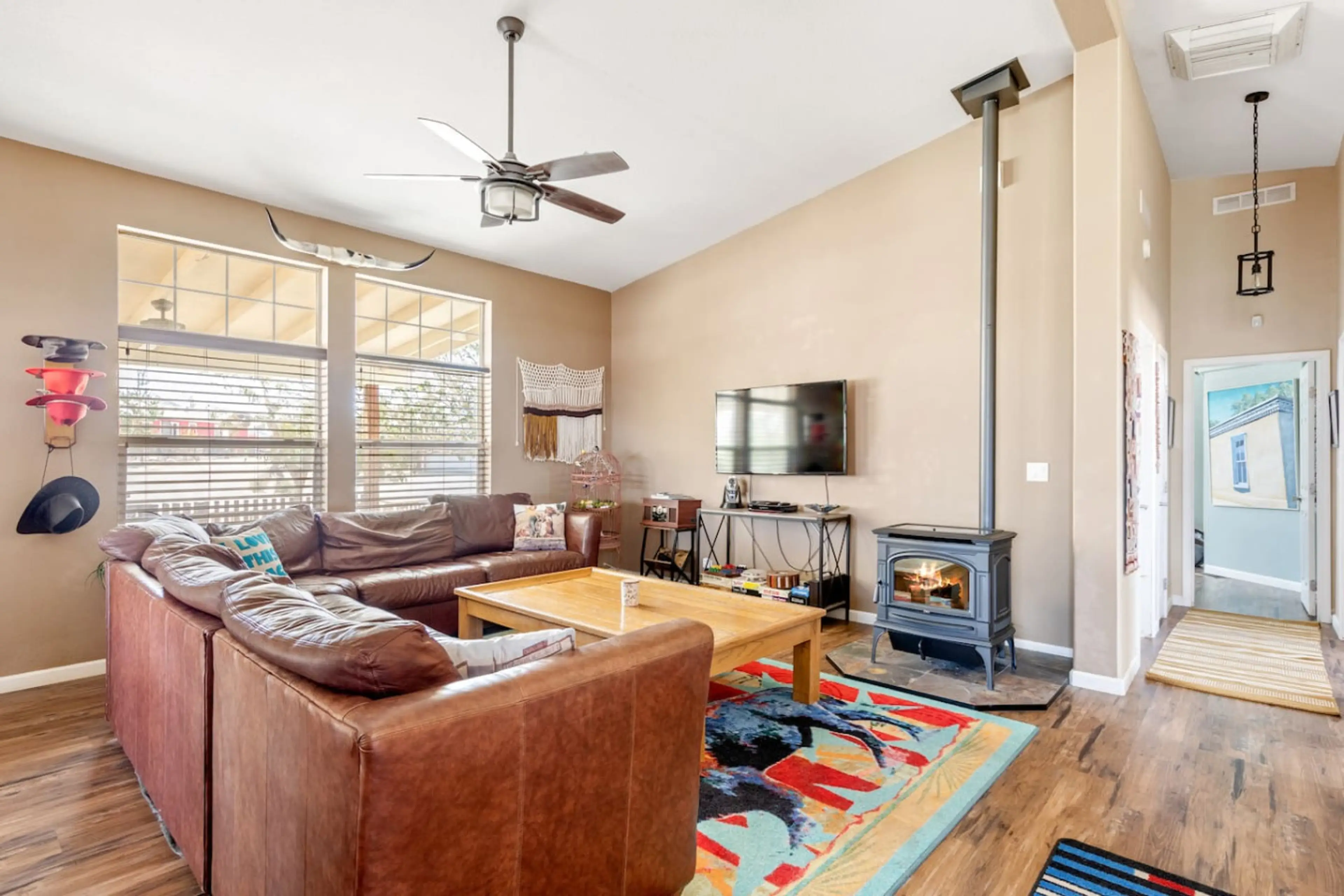 Set on 12 scenic acres with stunning views of lava buttes and Joshua trees, this private desert escape features two 3-bed/2-bath homes that sleep up to 14 guests. Each home offers spacious living, full kitchens, and desert-chic comfort. Enjoy a hot tub under the stars, shaded wraparound porch, fence...